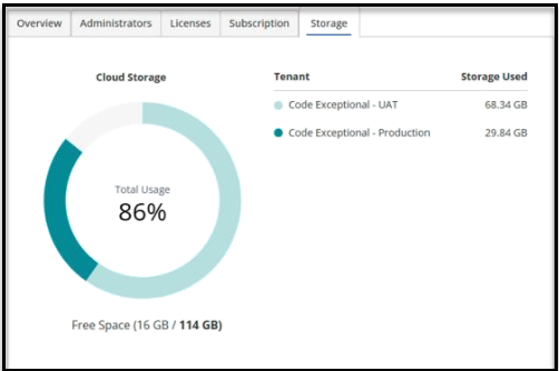 Available to customer admins, storage usage and notifications enable a user(s) to get visuals and emails as they approach their purchased storage amount.