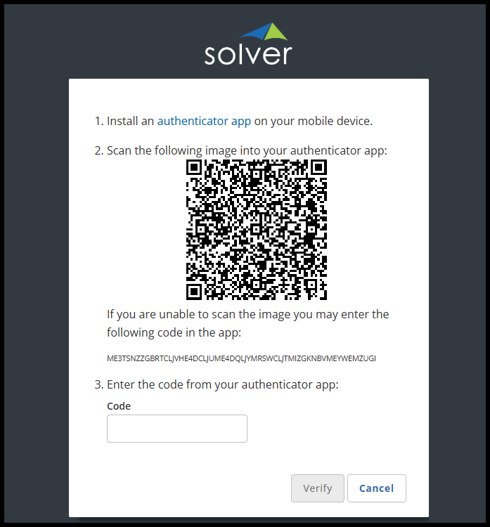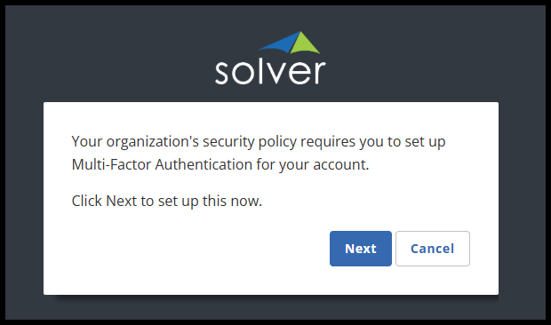 Once enabled, the next time any user logs in to Solver with their username and password, instead of going to the portal, they will be prompted to set up MFA for their account.