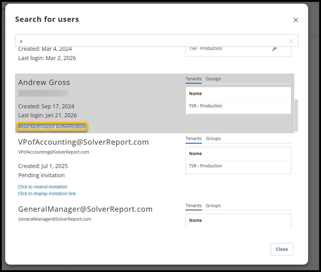 - Search for the user by email or username, and if that user has enabled MFA, a link to reset the MFA setup will be sent to their email.